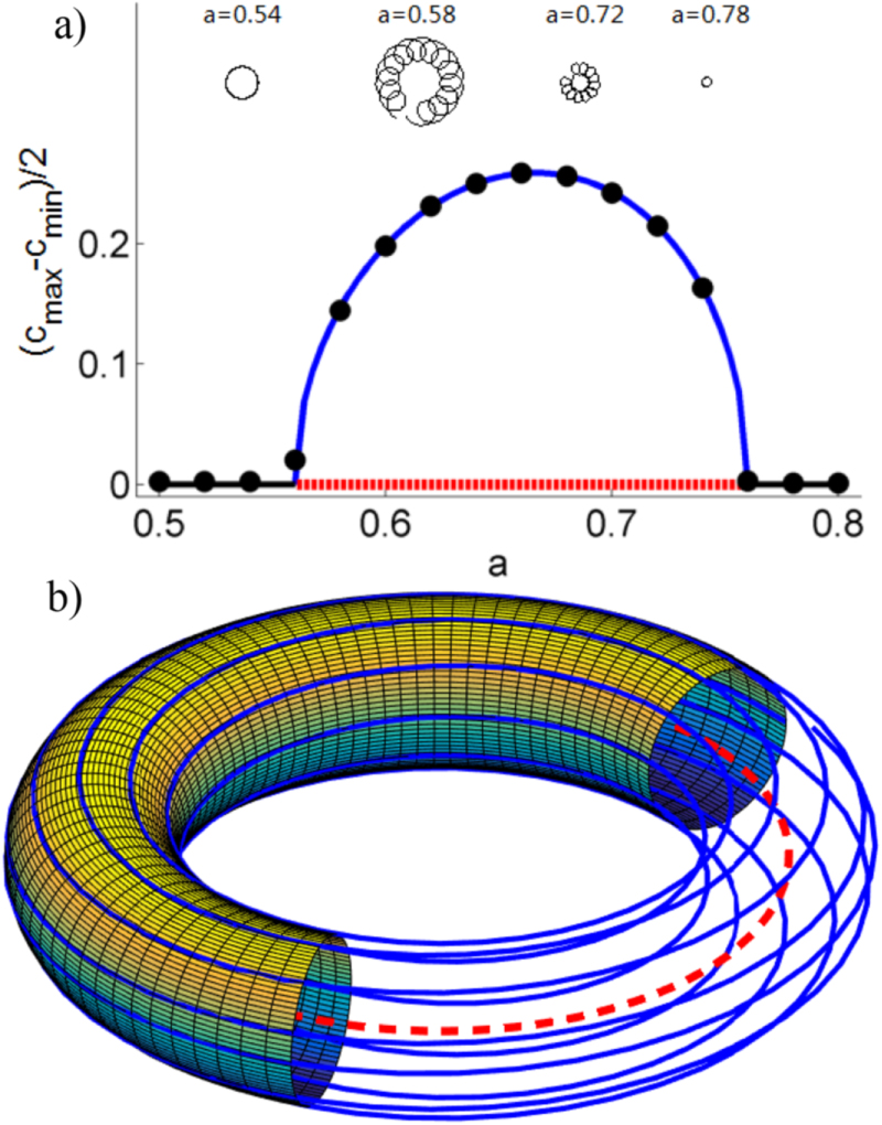 Figure 2(a) shows the numerically obtained bifurcation diagram for varying Barkley parameter a. Let us denote cmin and cmax the minimal and maximal displacement speed of the spiral wave tip during several spiral wave rotations. Then,