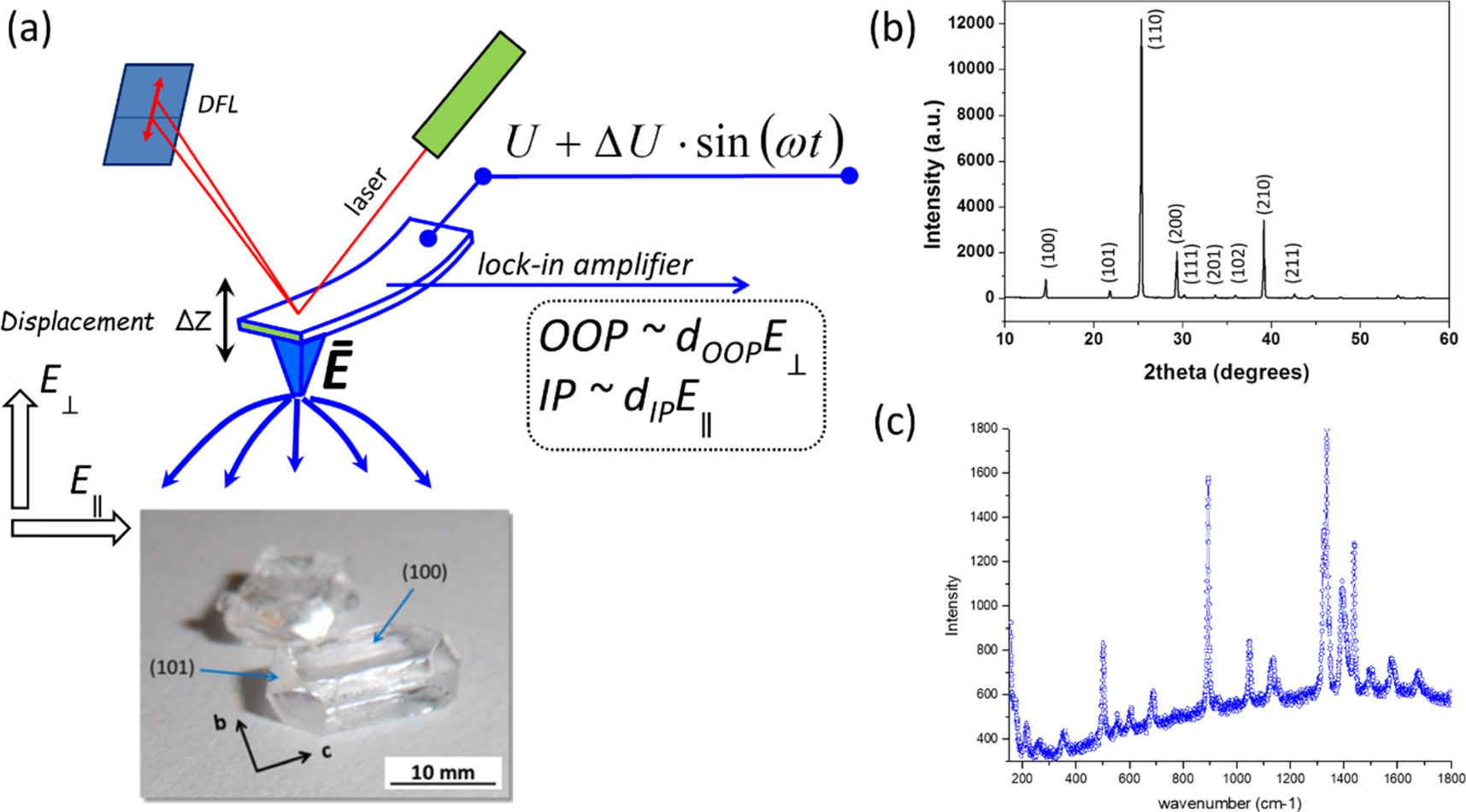 Figure 1. (a) The scheme of the PFM experiment and the optical microscopy image of γ-glycine polymorph single crystal grown along the c direction and possessing (010) and (100) lateral faces, (b) XRD and (c) micro-Raman patterns of γ-glycine phase polymorph.