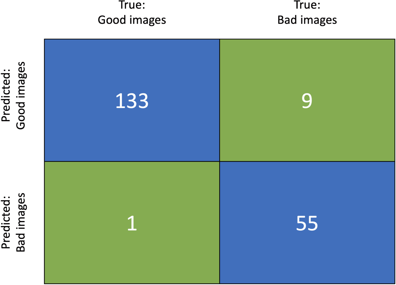Figure 3. Confusion matrix to test the accuracy of users classifications on a random sample of photocenter images. Clockwise from upper left: 133 True Positives (correct classification), 9 False Positives (incorrect classification), 55 True Negatives (correct classification), and 1 False Negative (incorrect classification).
