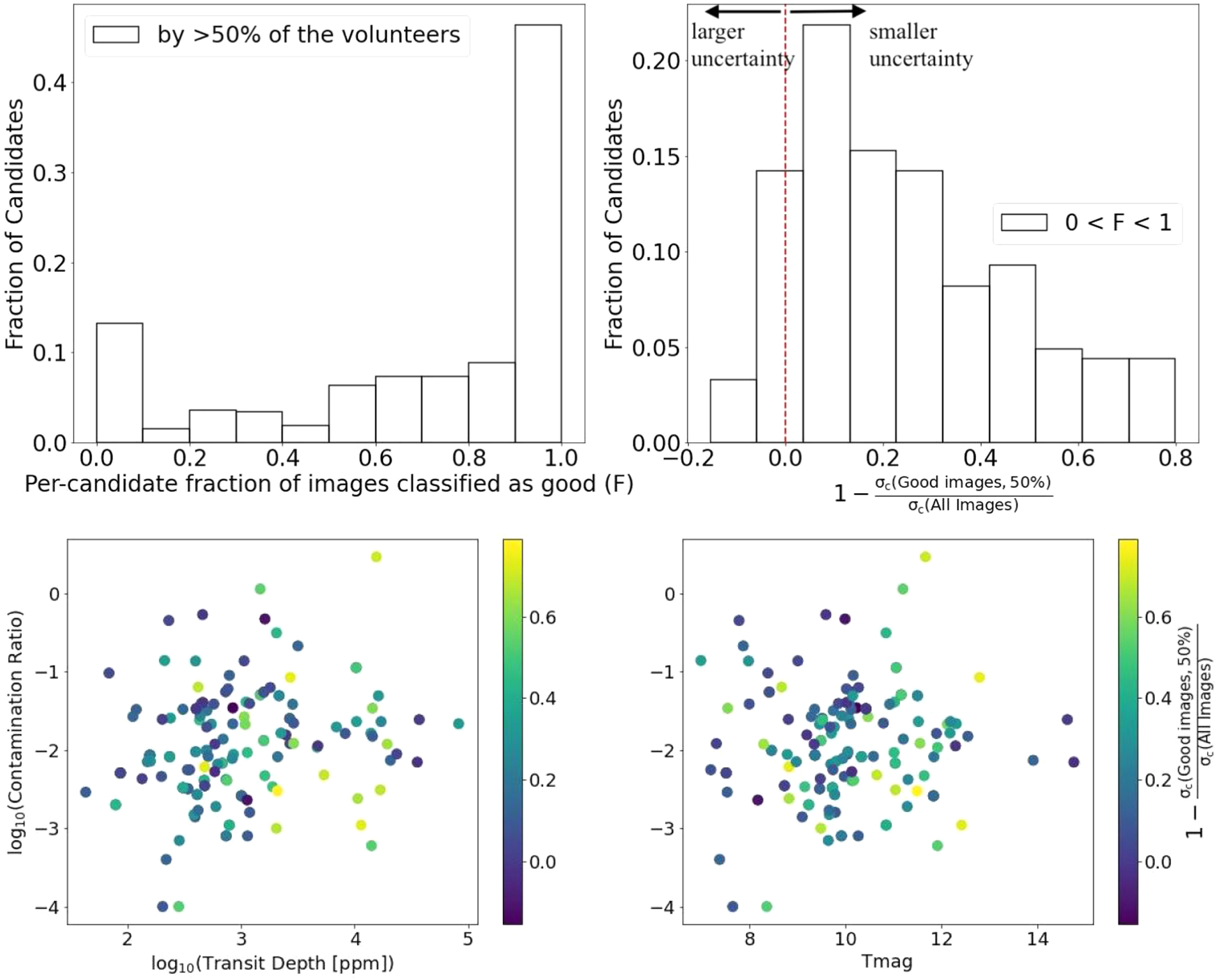 Figure 4. Upper left panel: fraction of planet candidates as a function of the per-candidate fraction of images, F, classified as good (i.e., responses 1 or 2 from Section 2) by at least 50% of the volunteers for each available sector of TESS data. Upper right panel: The corresponding distribution of improvements in the measured photocenter uncertainty, σc . For most of these candidates, removing the images flagged as poor by the volunteers results in up to ∼30% decrease in σc ; for some candidates σc decreases by up to a factor of five. See text for details. Lower panels: the improvements in σc as a function of the contamination ratio, transit depth, and TESS magnitude for the few hundred targets with contamination ratio as provided in the TESS Input Catalog.