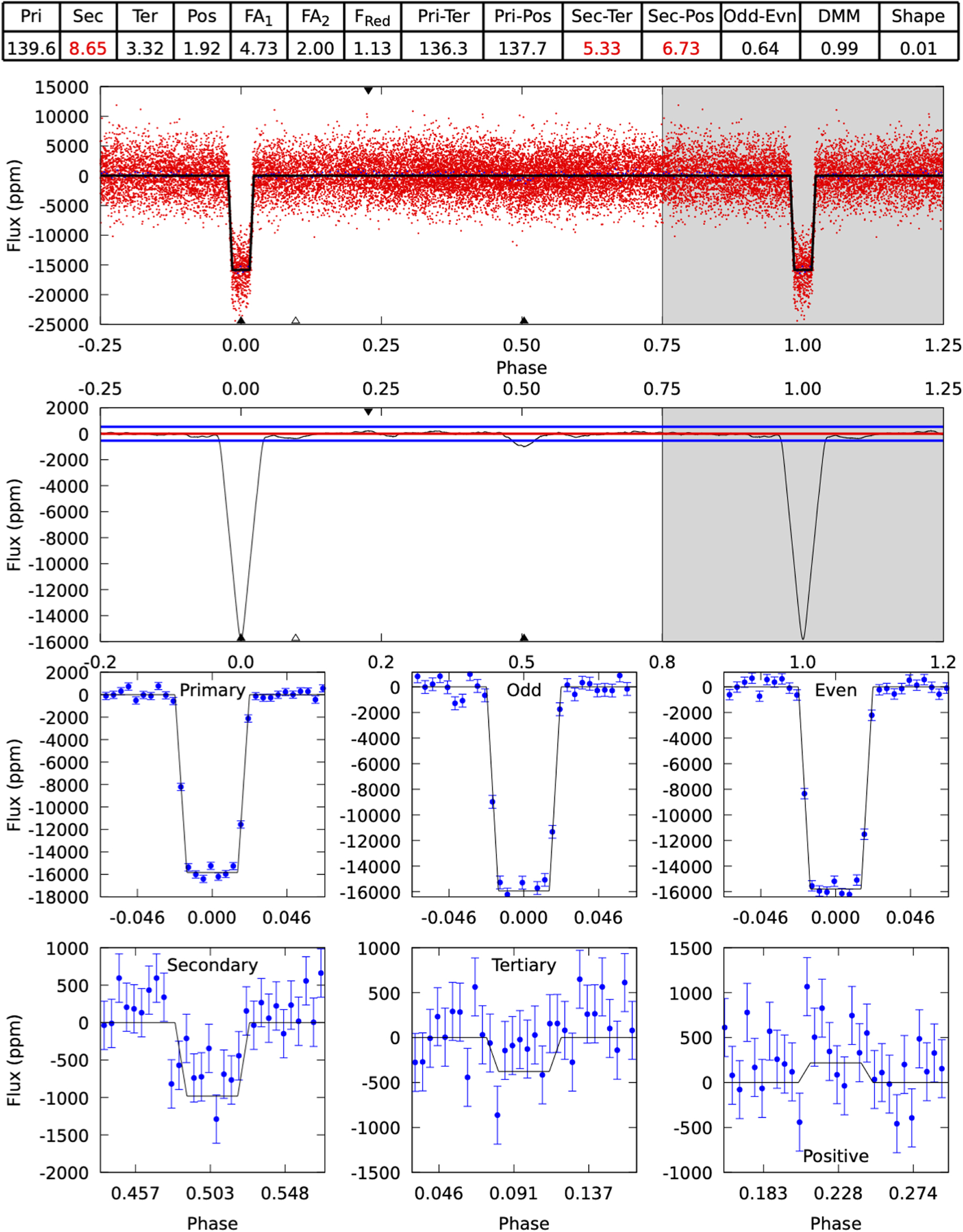 Figure 7. Results from DAVE's modshift module for planet candidate TIC 1449640. The module is designed to highlight significant secondary eclipses, odd–even differences between consecutive transits, etc. The upper panel shows the phase-folded light curve (red), the second panels show said light curve convolved with the best-fit trapezoid transit model (black curve in upper panel) along with the scatter in the light curve (blue horizontal lines). The lower panels show the best-fit model to all transits (label "Primary"), to all odd (label "Odd") and all even (label "Even") transits, to the best-fit secondary (label "Secondary") and tertiary (label "Tertiary") transits, and to the best-fit positive feature. The table above the figure represents the significance of the corresponding feature, such that a red number highlights a potential false positive sign. For the case of TIC 1449640, DAVE flags a clear secondary eclipse at phase ≈0.5. See text for details. Citizen scientists will ensure that the automated false positive flag is correct.