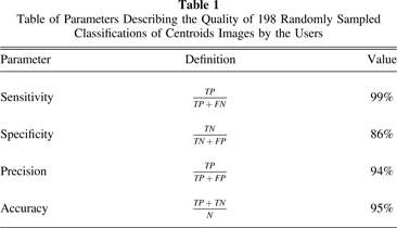 Table 1. Table of Parameters Describing the Quality of 198 Randomly Sampled Classifications of Centroids Images by the Users