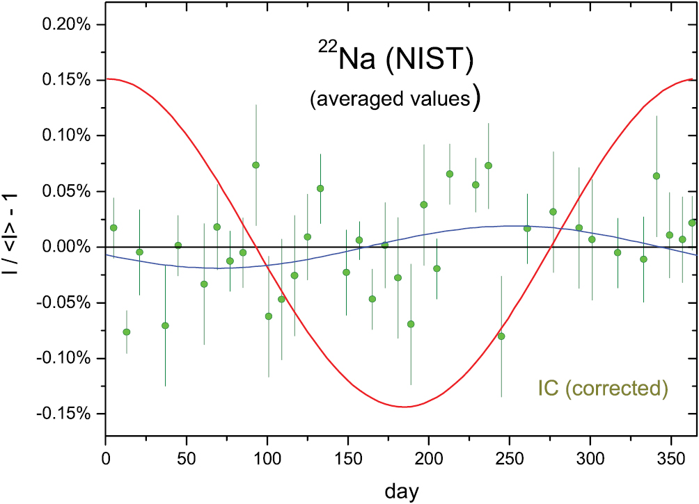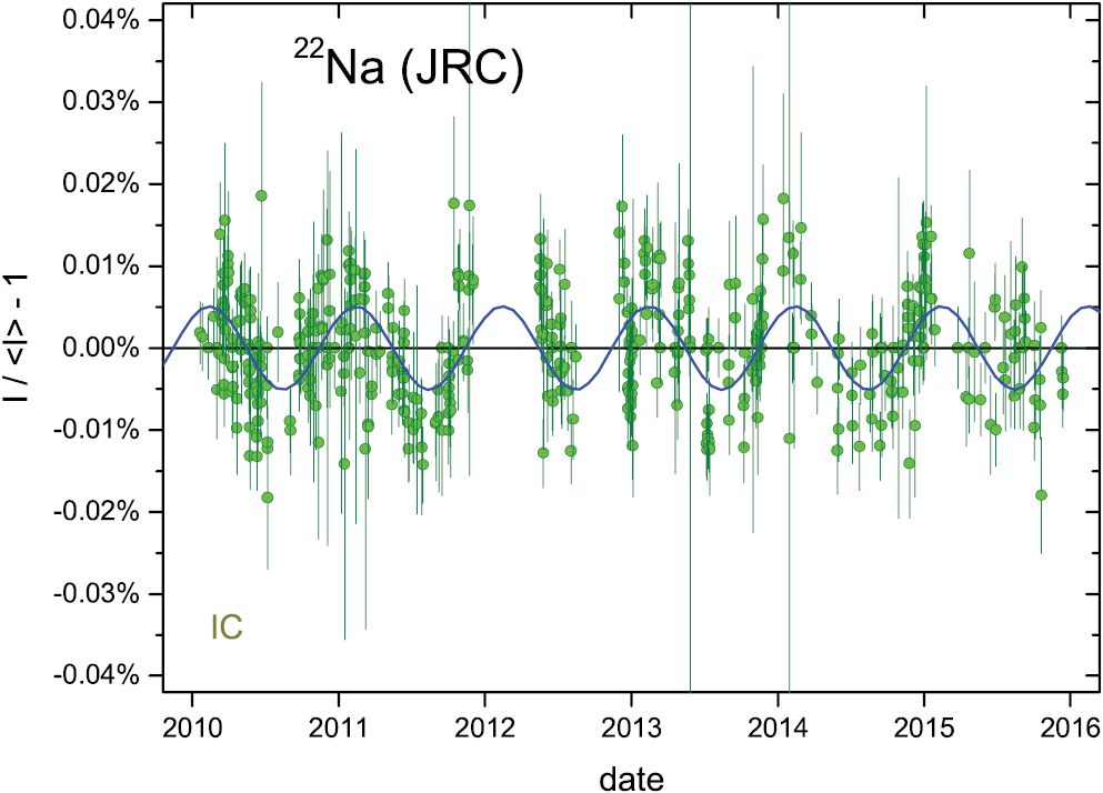 At the JRC (Geel, Belgium), the decay of a 22Na source in aqueous solution inside a sealed glass vial was followed in the IG12 IC between 2010 and 2016. The fitted half-life is in excellent agreement with the evaluated value in literature [21]. The residuals to an exponential decay curve presented in figure 1 do not exceed 0.02%. Consequently, the presence of permille-level modulations at frequencies of days, weeks, months or even a few years can be excluded. The annual averaged residuals in figure 2 show hints of a very small residual annual oscillation with an amplitude of only A = 0.0047 (6)% and a phase of a = 53 d. The amplitude and phase are almost identical as for 134Cs measured in the same conditions [2, 3], which points to a common origin of physical or instrumental nature. These results set a new upper limit to the solar effect on 22Na decay—if there is any at all – which is an order of magnitude lower than in [4].