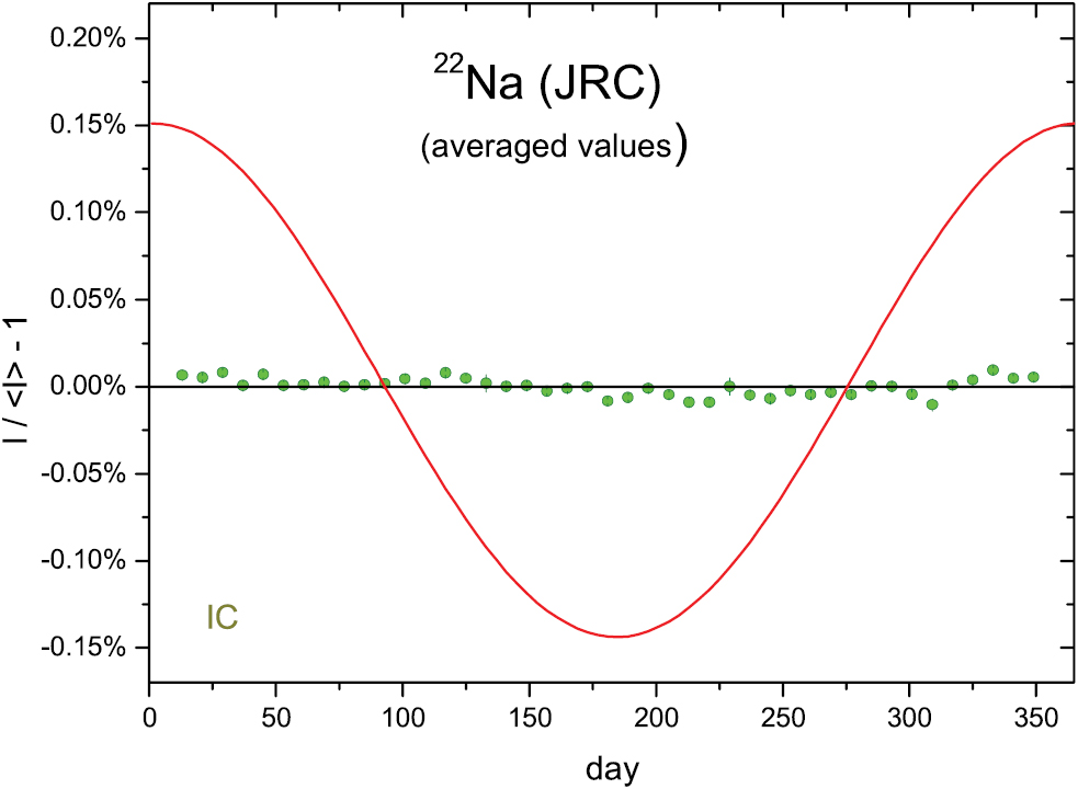 Standard image High-resolution imageFigure 2. Annual average residuals from exponential decay for 22Na activity measurements with the IG12 IC at JRC. The line represents relative changes in the inverse square of the Earth-Sun distance, normalised to 0.15% amplitude.