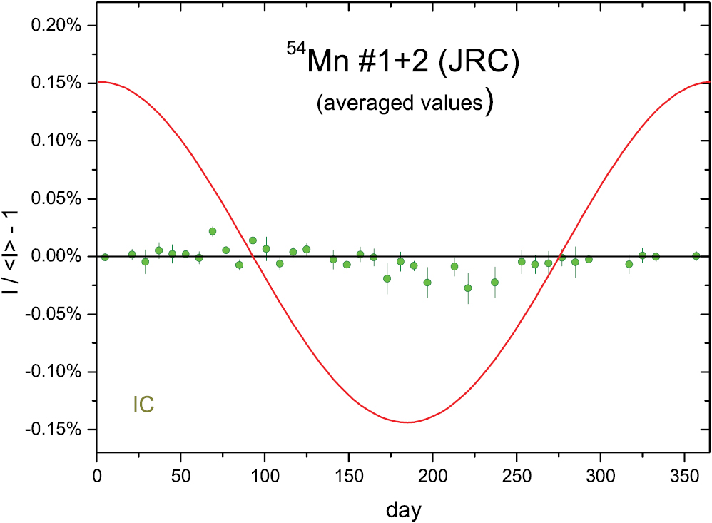 Whereas the experimental evidence of permille-sized seasonal modulations in radioactive decay has been mostly focussed on β− decay (see e.g [4–6].), similar cases have been reported involving EC and β+ decay. O'Keefe et al [7] reanalysed 22Na/44Ti decay rate ratio data measured by Norman et al [8] and reported a weak annual variation at sub-permille level. Ionisation chamber measurements of 152Eu at PTB have been known to show seasonal effects [5, 10], but PTB metrologists related them to varying laboratory conditions affecting the instrumentation [9, 10]. Jenkins and Fischbach [11] claimed that the decay of 54Mn is influenced by solar flares and Mohsinally et al [12] reported correlations with solar storms. Jenkins et al [5] included 54Mn in the list of nuclides with permille level annual modulations, whereas this was refuted by Silverman [13] on the basis of a mathematical analysis of half-life measurement data by Van Ammel et al [14] at the JRC (see section 3.2). From a metrological point of view, the mere observation of seasonal modulations is insufficient proof of the variability of decay constants as long as instrumental instability cannot be ruled out as a plausible cause of the observed effects [15–17].