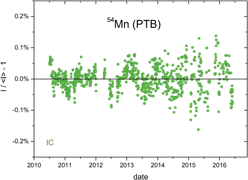 Standard image High-resolution imageFigure 8. Annual average residuals from exponential decay for 54Mn activity measurements with the IG12/A20 IC at PTB.