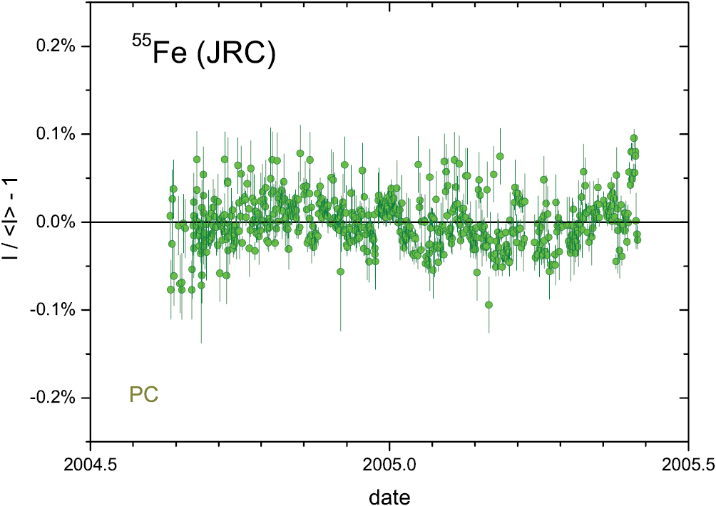 From August 2004 to May 2005 at the JRC, Van Ammel et al [24] measured the decay rate of an electrodeposited 55Fe source on a copper backing and covered with an aluminium foil in a fixed defined low solid angle counter [20] with beryllium window and argon(90%)-methane(10%) filled wire proportional counter (PC). The residuals in figure 9 are small but show autocorrelations which complicate the uncertainty assessment of the half-life measurement [15, 24]. Some of these autocorrelations reappear in the annual averages in figure 10 (since the experiment covered less than one year) but in spite of the metrological difficulties it has been demonstrated that physically induced annual cycles, if they occur, must be extremely small (A = 0.004 (3)%, a = 187 d).