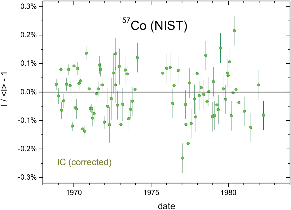 From 1962 to 1966, a 57Co source was measured 99 times in the NIST IC 'A' [22], from which 2 data were excluded from analysis. The residuals to an exponential decay curve, shown in figure 11, are generally smaller than 0.2% in magnitude. The fitted sinusoidal function to the annual averaged residuals in figure 12 is well below permille level (A = 0.055 (22)%, a = 187 d).