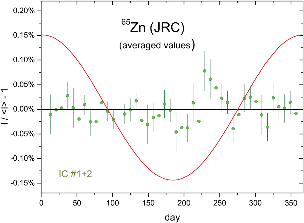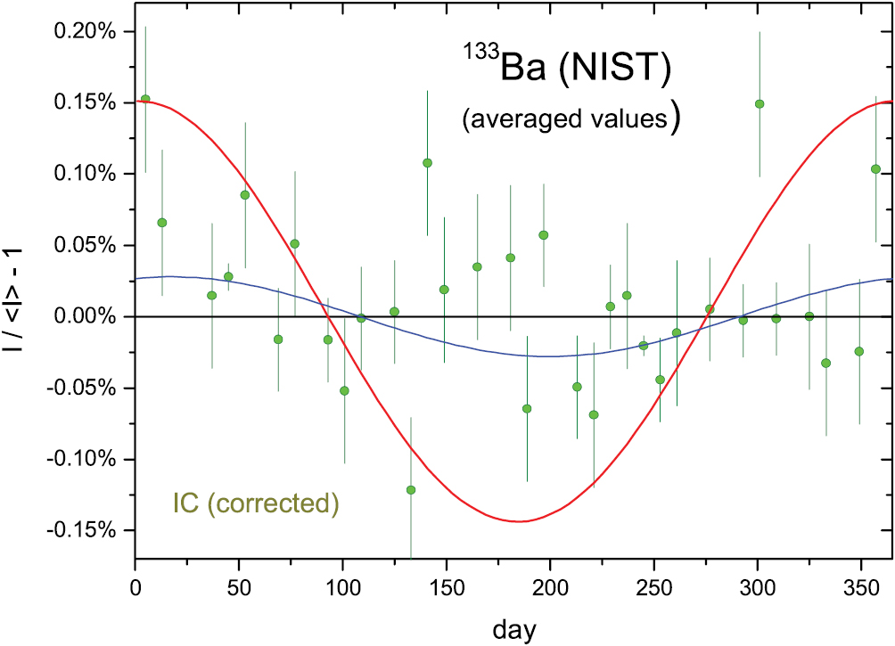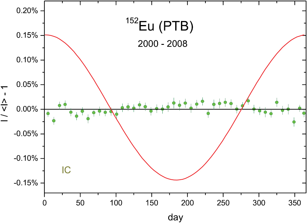 Additional activity measurements (Source No.1952) were performed by γ-ray spectrometry using a HPGe detector. The ratio of the net gamma-ray emission rates of the 776.517 keV 82Sr γ-ray line to the 661.657 keV 137Cs γ-ray line was followed for 222 d. The residuals to the fit of the decay curves have been published by Pibida et al [26]. The HPGe data are quite stable (A = 0.073 (75)%, a = 163 d), but the IC measurements even more so with a fitted amplitude for annual modulations in the 10−6 level (A = 0.0006 (27)%, a = 240 d). The annual averaged residuals of the IC measurements are shown in figure 14.
