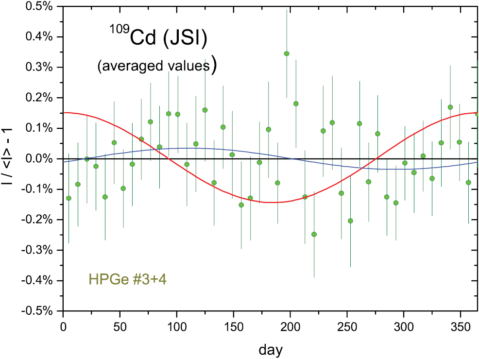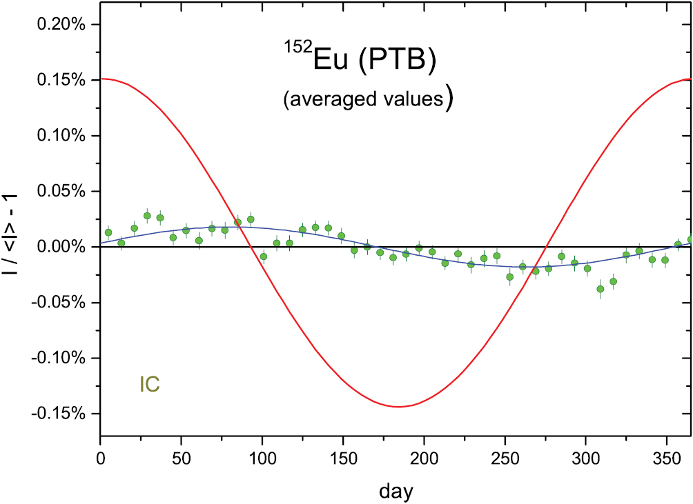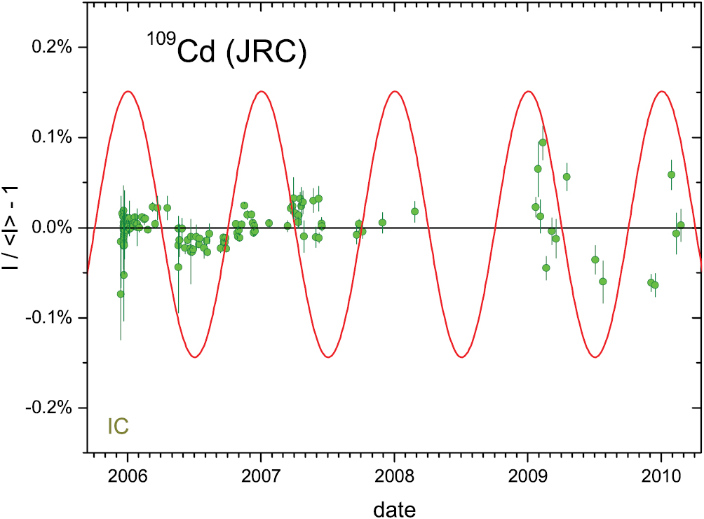 Figure 15. Residuals from exponential decay for 109Cd activity measurements with the IG12 IC at JRC. The line represents relative changes in the inverse square of the Earth–Sun distance, normalised to 0.15% amplitude.