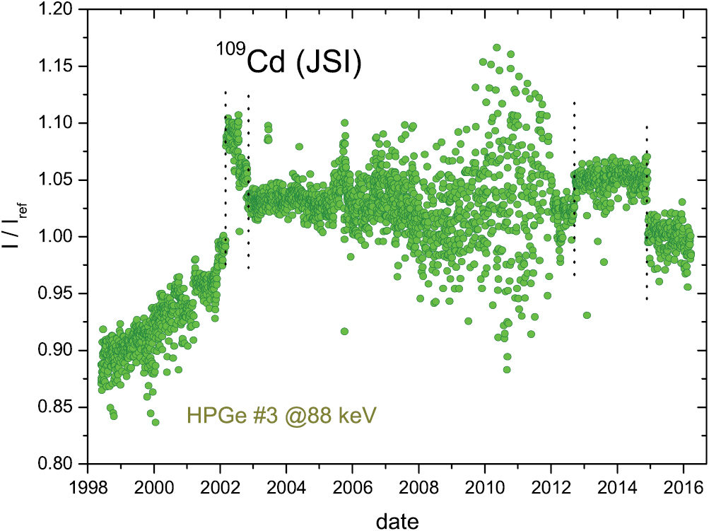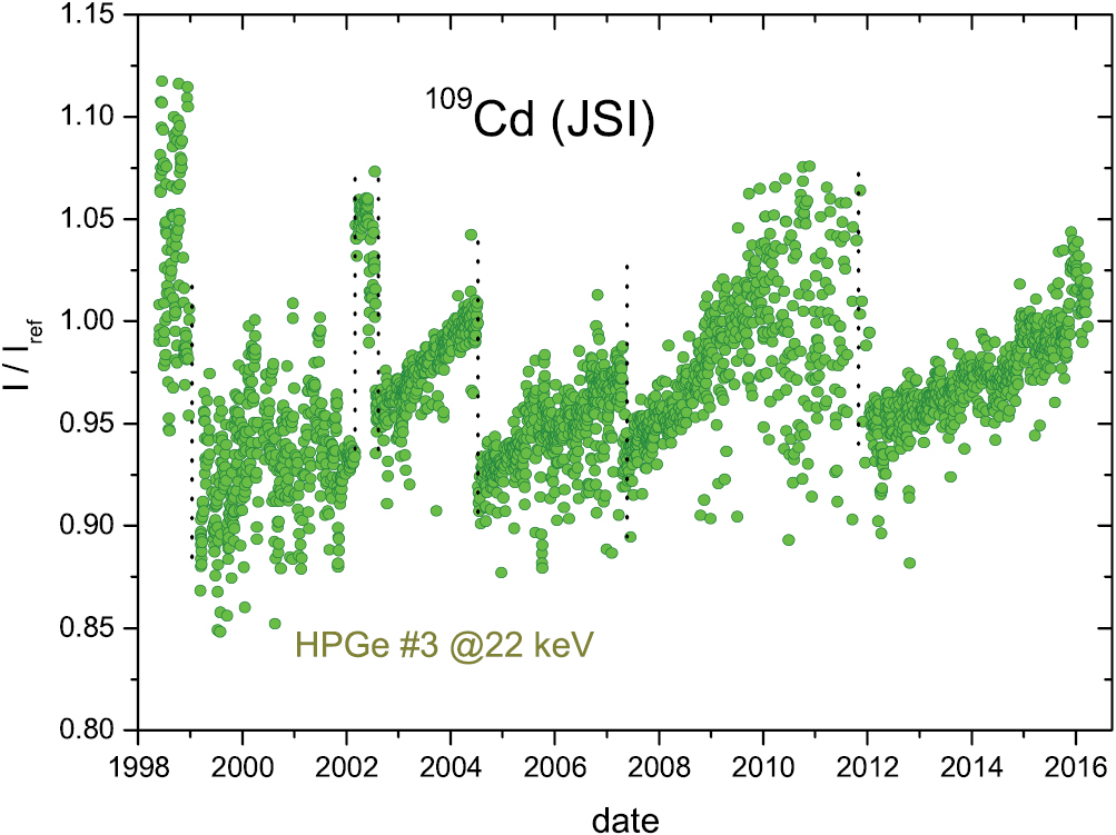 Besides the 88 keV γ ray, 22 keV x-rays are emitted after the EC decay of 109Cd or as a consequence of internal conversion of 109mAg (T1/2 = 39.7 s). Both emissions are regularly measured in HPGe detectors at the JSI (Slovenia). Due to the low energy of the radiation, their detection is very sensitive to absorption effects and small changes in geometry. From 4 data sets measured between 1998 and 2014/2016 (see figures 17–20), 3 were selected and compensated for recalibrations of the detector and systematic drift in the initial part of the 88 keV results in detector #3. The 22 keV data in detector #3 were excluded because of the saw-tooth drift. Thus restricting the analysis to residuals in the flat regions, one obtains annual averages (figure 21) with a mild seasonal effect (A = 0.035 (24)%, a = 346 d). More importantly, these data sets, in comparison with the 60Co data [2] on the same detectors, demonstrate how detection instability strongly depends on the energy of the radiation.