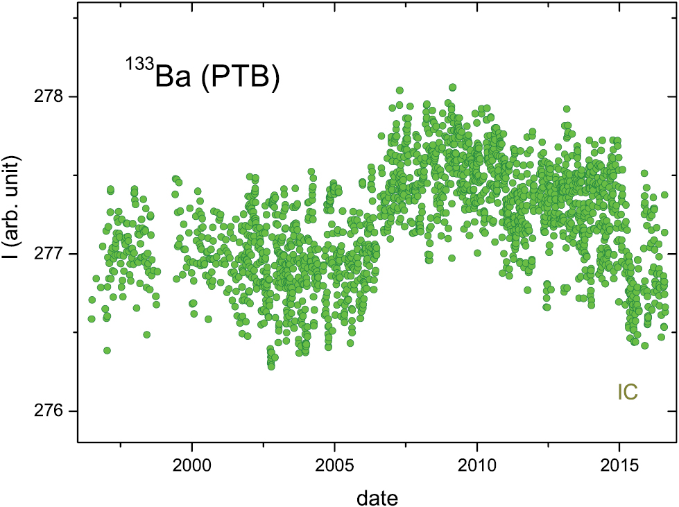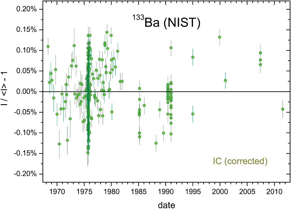 A 133Ba source was measured 138 times from 1979 to 2012 with the IC 'A' [22] at the NIST. A linear adjustment was made for the time period after 1991 and 7 among the most recent measurements were excluded from the analysis because of a growing bias. In figure 24, the residuals from exponential decay do not exceed a magnitude of 0.15%. Since the data were not evenly distributed, several averaged residuals in figure 25 show a similar precision and a relatively mild seasonal modulation (A = 0.028 (8)%, a = 74 d). The data do not confirm the claim of 'strong' annual modulations [5].