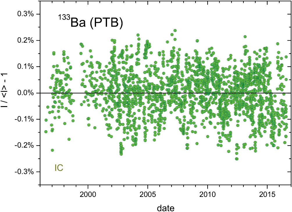 Standard image High-resolution imageFigure 28. Annual average residuals from exponential decay for 133Ba ionisation current measurements with the IG12 IC at PTB.