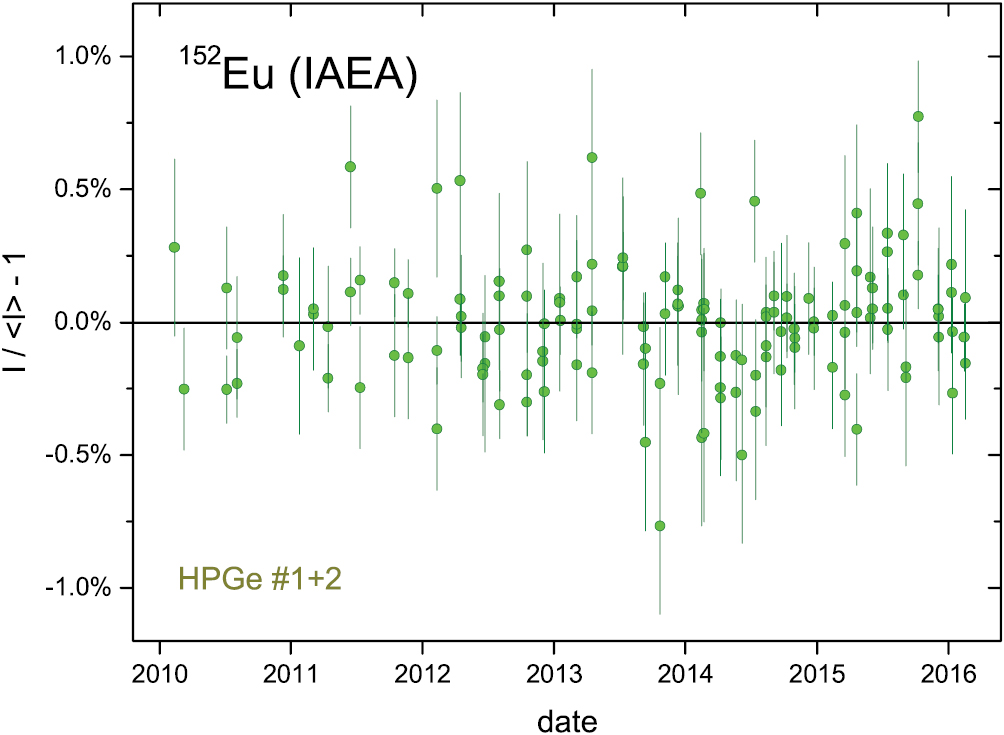 At the Terrestrial Environment Laboratory of the IAEA (Seibersdorf, Austria), a 152Eu point source was measured on two HPGe detectors for quality control between 2010 and 2016. Four data sets were derived from the background-corrected count integral of the γ-ray spectra and from the sum of net peak areas of the 40, 122, 344, 778, 964 and 1408 keV emissions. After elimination of extreme data, 143 residuals of typically 0.1%–0.3% were combined in figure 29. The average deviations in figure 30 are free of annual oscillations below permille level (A = 0.020 (24)%, a = 162 d).