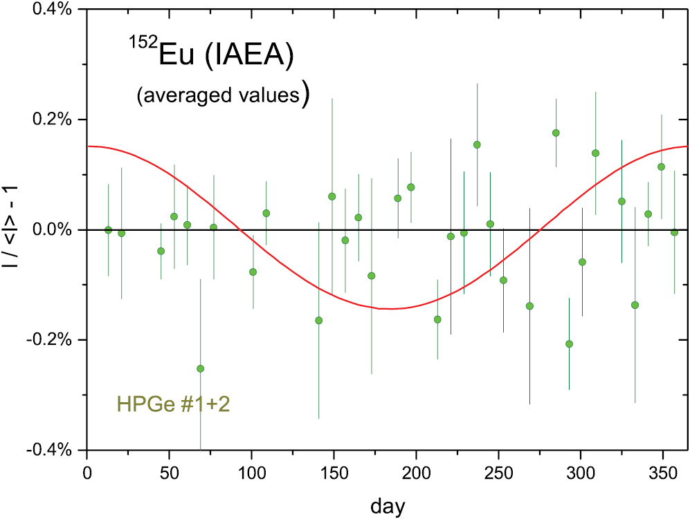 Standard image High-resolution imageSeveral authors have speculated that beta decay would be susceptible to 'external' influences and alpha decay not, which would explain why less seasonal effects have been observed in alpha decay (see e.g. [5–7, 29, 32]). From a metrological point of view, an explanation could be that it is easier to establish measurement stability for alpha particles with high, discrete energies than for beta particles with lower, variable energies. When not measuring the particles but the subsequent γ-ray emission, the metrological difficulty is similar for both types of decay. It turns out that the annual oscillations of the 241Am (α decay) γ-ray data are almost identical to those of the 152Eu (EC, β−, β+ decay) data in the 8 HPGe detectors of SCK, as shown in figure 35. This is a very strong indication that the instabilities are of instrumental nature and not caused by 'external' influences.