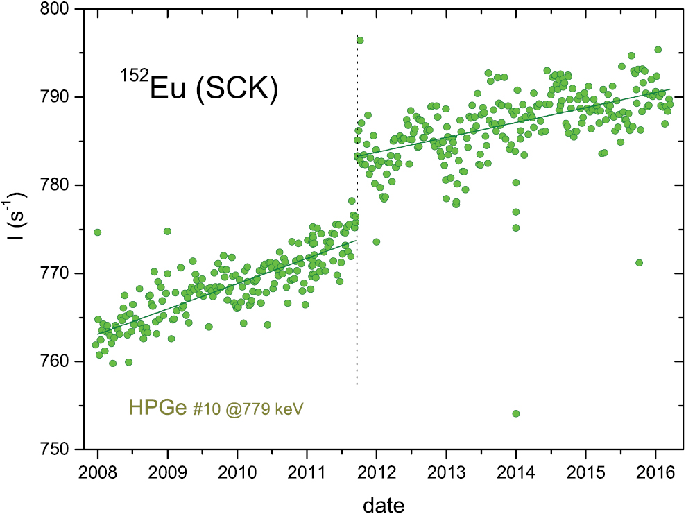 Figure 31. Decay-corrected integrated net peak count rates at 779 keV from the decay of 152Eu measured by γ-ray spectrometry with the HPGe #10 detector at SCK. The jump corresponds to a change in data acquisition system.