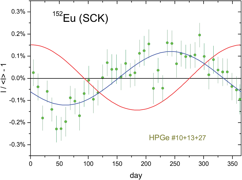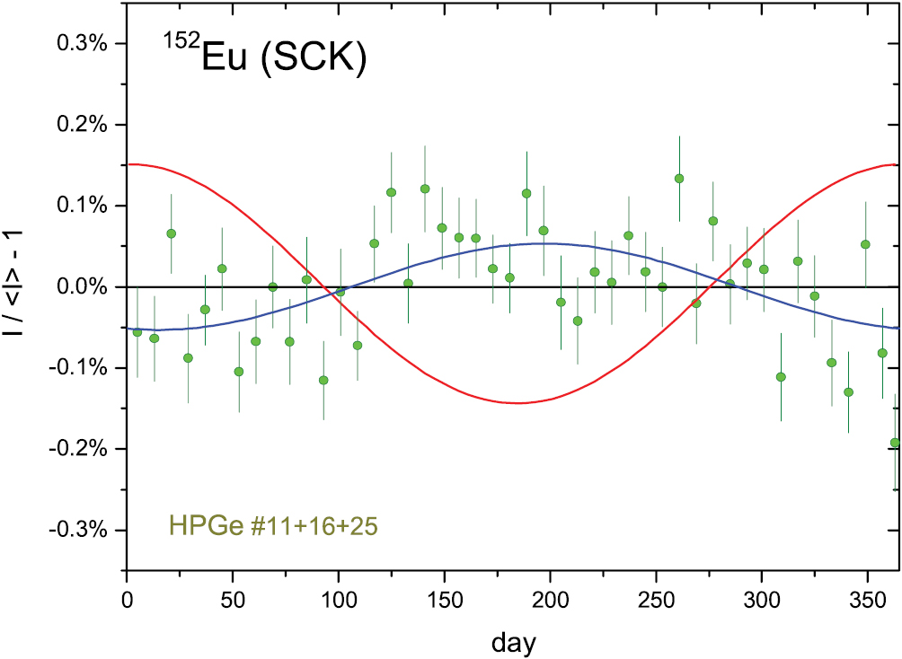 Standard image High-resolution imageFigure 33. Annual average residuals from exponential decay for 152Eu decay rate measurements by γ-ray spectrometry with HPGe detectors #11, #16 and #25 at SCK. The fitted sinusoidal has an amplitude of 0.053%.