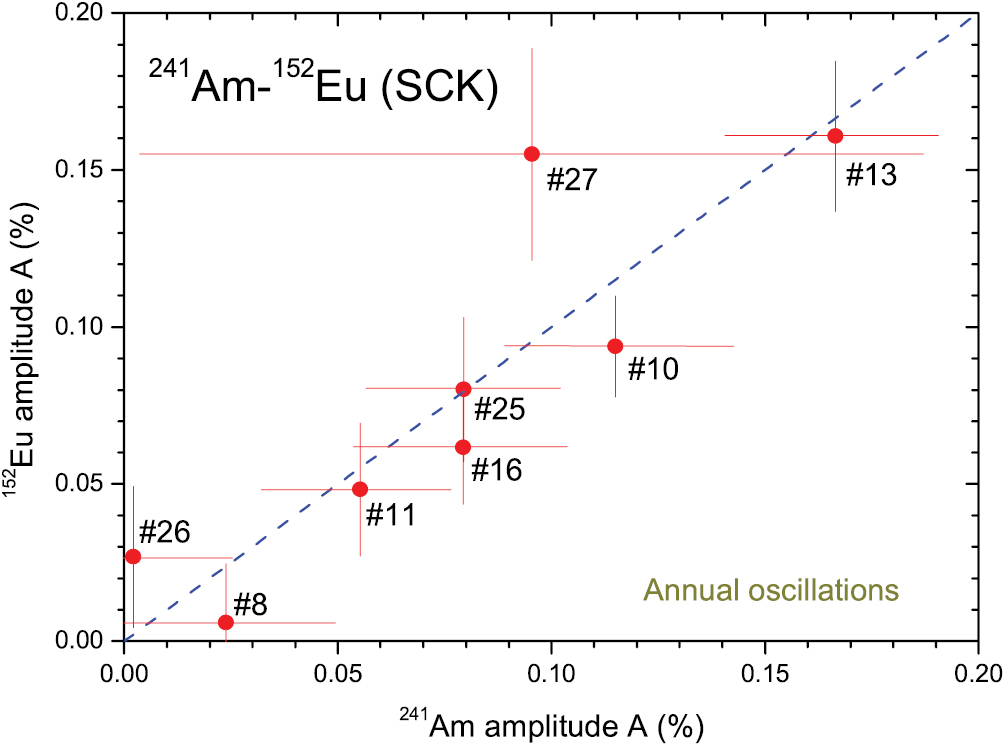Figure 35. Amplitude of average annual oscillations in the decay rate of 241Am and 152Eu measured by γ-ray spectrometry with 8 HPGe detectors at SCK between 2008 and 2016.