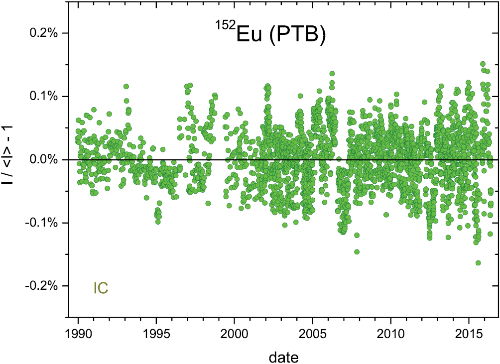 Standard image High-resolution imageFigure 39. Annual average residuals from exponential decay for 152Eu activity measurements (relative to a 226Ra check source) with the IG12/A20 IC at PTB.
