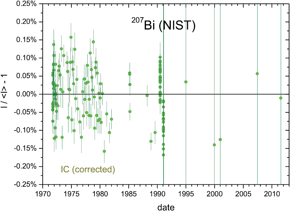 The decay of a 207Bi source was followed over four decades with the IC 'A' [22] at the NIST. Linear adjustments were made for slow geometrical changes in the source holder [23], and additionally for long-term detrending purposes (over three multi-annual time zones) in this work. The residuals from exponential decay in figure 42 are mostly concentrated in the first decade and in 1990. The annual averaged residuals in figure 43 are mostly within 0.1% and show no appreciable seasonal modulation (A = 0.004 (11)%, a = 23 d).