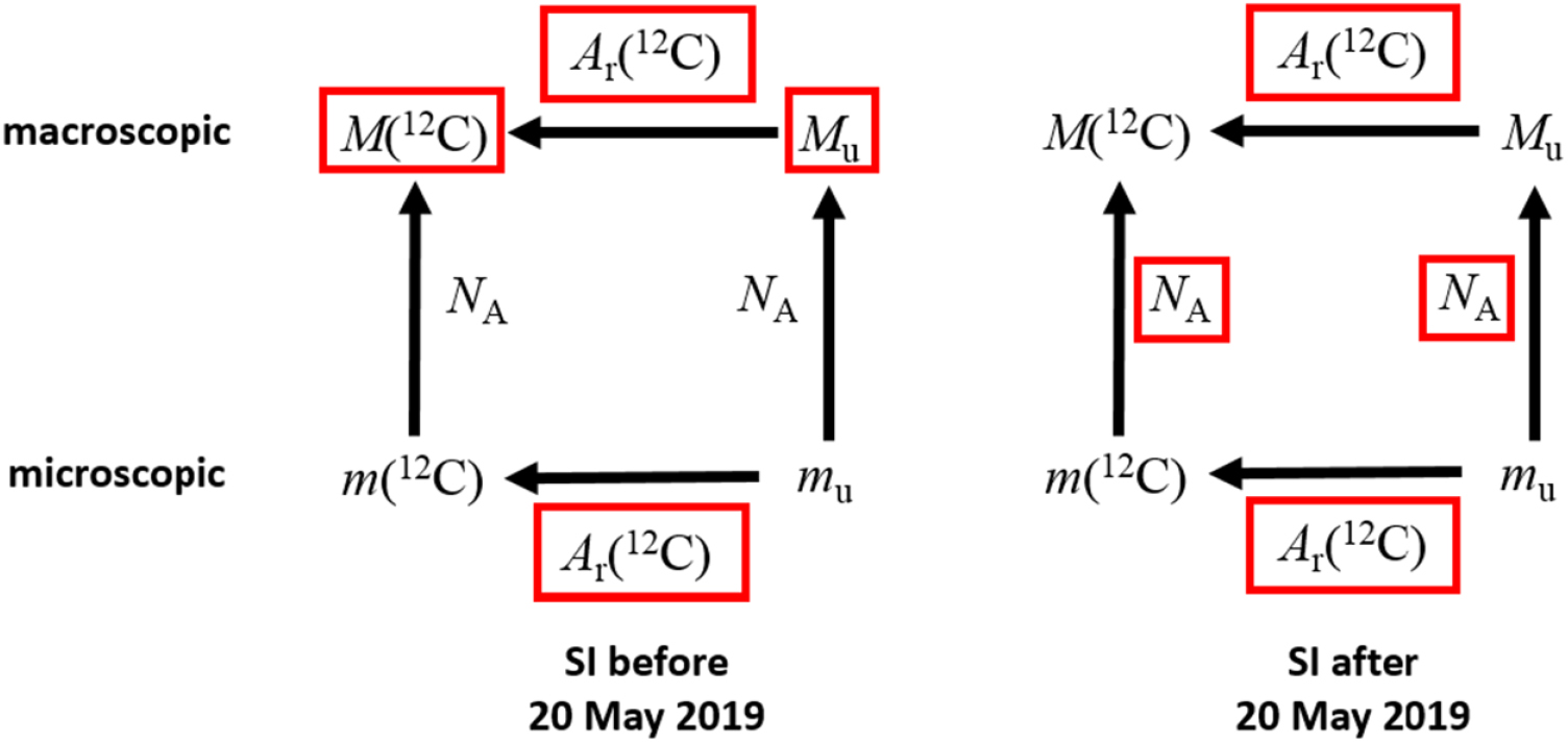 Figure 1. Diagrammatic relationship between the quantities: atomic mass constant, mu; molar mass constant, Mu; relative atomic mass of 12C, Ar(12C); molar mass of 12C, M(12C); mass of one atom of 12C, m(12C); and the Avogadro constant, NA, before and after SI revision. The direction of the arrow indicates multiplications (for instance, mu × Ar(12C) = m(12C)). Those quantities with a fixed numerical value and zero uncertainty are shown with a red box around them (for instance, Ar(12C) ≡ 12 is unchanged by the revision of the SI). Adapted from [35]. © BIPM and IOP Publishing Ltd. All rights reserved.