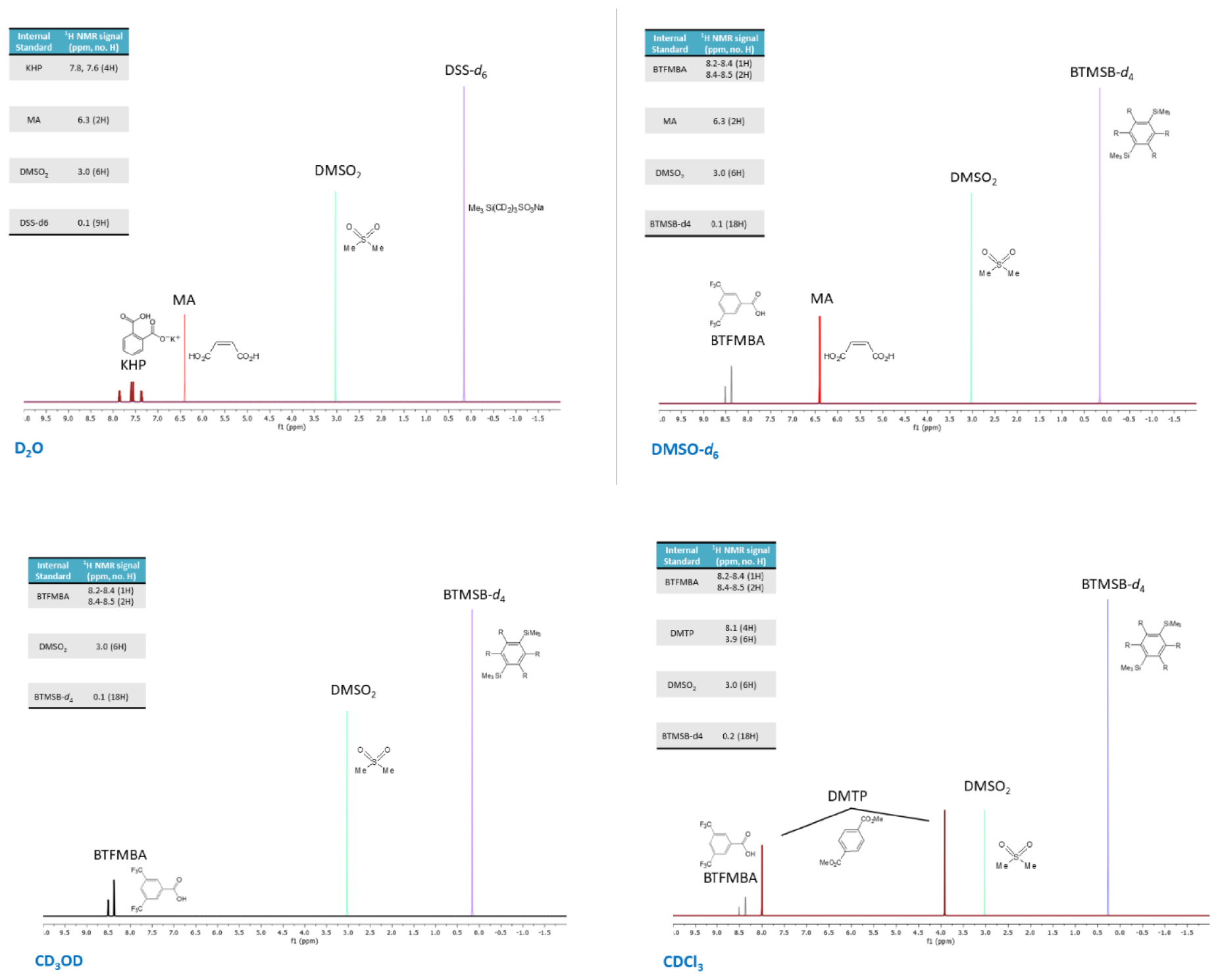 The purity of DMSO2 was also assigned using the indirectly assigned standards for MA (in solution in D2O and DMSO-d6), BTMSB-d4 (in DMSO-d6, CD3OD and CDCl3) and DMTP in CDCl3 respectively.