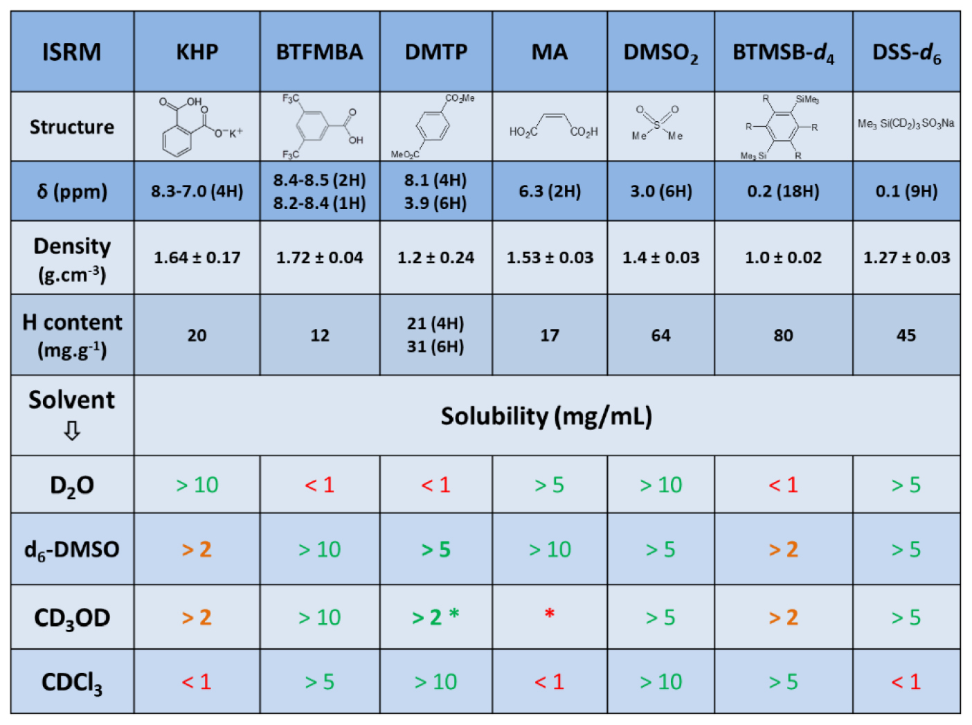 Figure 2 summarizes properties of the seven ISRMs relative to these requirements. It is recognized that these characteristics constitute a 'wishlist' rather than being prescriptive and that not all the materials in the ISRM suite fully comply with all the specifications. Nevertheless they serve as useful selection guidelines and the materials identified in figure 2 can meet most of these requirements while several potentially meet all of them. The solubility of the ISRMs were evaluated at the BIPM and are expected to be indicative for other solvents having similar solubilizing capabilities. The four solvents referred to in figure 2 are those most commonly utilized for solution 1H-qNMR measurements.