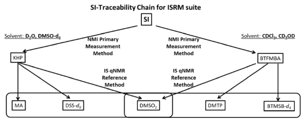 It should be noted that the calibration hierarchy shown in figure 3 reflected the availability of suitable high purity CRMs to act as the primary link to the SI at the time these studies were undertaken. It should not necessarily be regarded as constituting a definitive heirarchy for higher order qNMR refrence materials. Rather it reflects the current situation where CRMs having a suitably small uncertainty in their assigned purity to act as the apex for SI-traceability are currently primarily organic carboxylic acids certified by titrimetric methods. If techniques were available that could provide high purity CRMs of other of the proposed ISRMs, notably DMSO2, having a suitably small value for the measurement uncertainty of the purity assignment then simpler traceability chains of equivalent metrological rigour could be proposed.