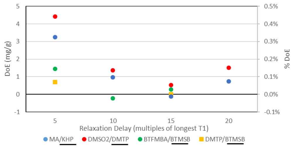 The choice of an appropriate repetition time between acquisition pulses is a critical parameter for accurate qNMR [22]. For the quantified signal integrals to accurately reflect the number of 1H nuclei giving rise to each signal, a pulse interval (TR) must be chosen that allows sufficient time for the quantitative reestablishment of the initial distribution of energy states of both signals prior to the next acquisition cycle. The value of TR depends on and is typically set to a multiple of the longer of the spin-lattice relaxation times (T1) of the signals subject to quantification. It has been reported that use of the common value of TR/T1 > 5 may introduce bias due to non-uniform recovery in some cases [23]. We investigated the influence of pulse interval on the efficiency of signal recovery. For each model system, the T1 constants for both quantified signals were determined using a standard inversion-recovery sequence [9]. The qNMR experiment was then undertaken using a 90° excitation pulse and TR corresponding to 5, 10, 15 and in some cases 20 times the longest T1 in each system. Figure 4 plots the DoE with the reference value of the purity of the component of the model system having the shorter T1 as a function of the ratio TR/T1.