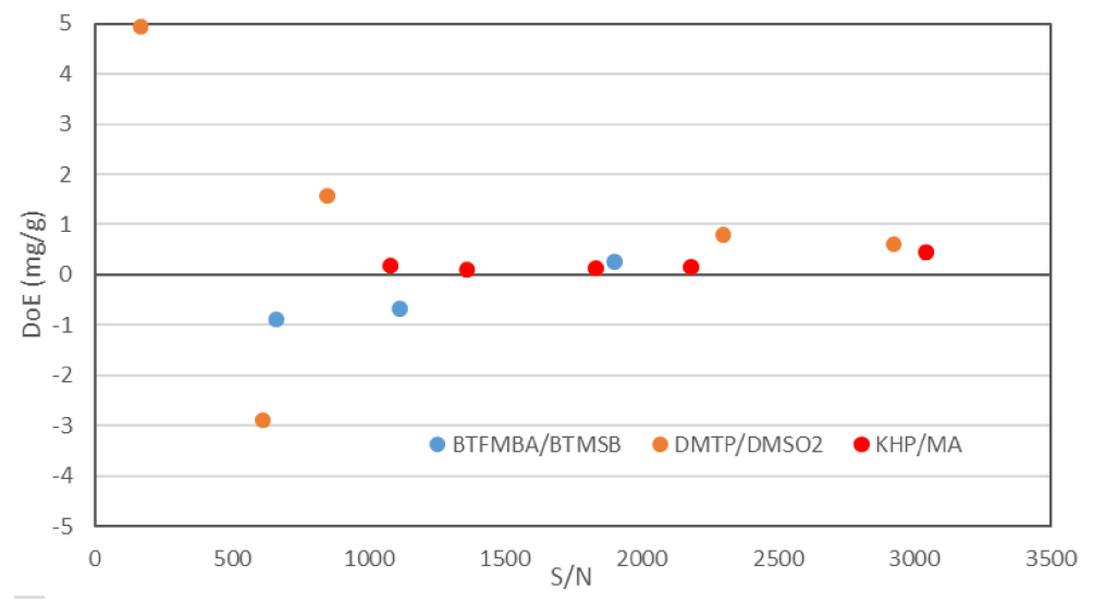 A series of experiments were undertaken using three of the model systems. The results are shown in figure 6 where the DoE obtained in our hands confirmed this finding. Ideally the smallest S/N of the two quantified peaks should exceed one thousand but further increase in the ratio afforded no significant decrease to the associated measurement uncertainty.