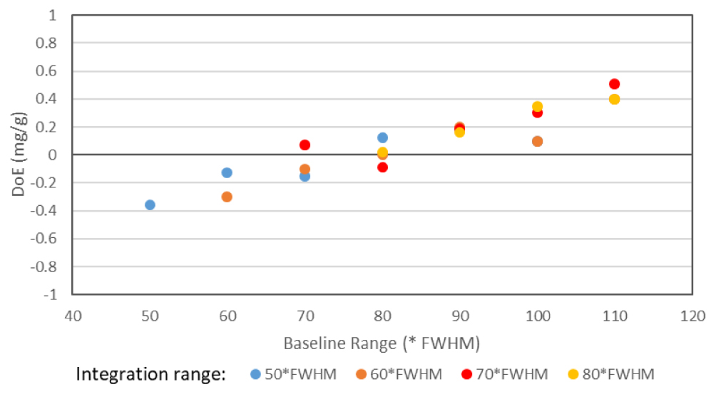 An in-depth study was undertaken using KHP and MA in D2O as model system of the influence of baseline and integration range on the accuracy of quantification of the MA peak. Standard acquisition parameters (90° excitation pulse, TR = 15 * T1, 256 scans) were used to obtain the spectrum and the two signals were integrated using combinations of baseline and integration ranges calculated as multiples of the FWHM of the MA peak. Figure 7 shows the DoE for the quantification of the MA content as a function of the baseline range for the MA peak (plotted as multiples of the FWHM of the MA peak) using four diffferent integration ranges (also multiples of the MA peak FWHM).