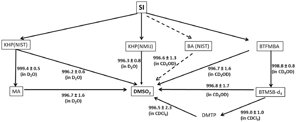 Standard image High-resolution imageAs discussed later, alternative traceability chains could be developed depending on the availability of suitable primary reference materials. SI-traceable purity assignments for MA, DSS-d6 and DMSO2 were made by qNMR. with a KHP CRM as the internal standard in solutions in D2O and for DMTP, DMSO2 and BTMSB-d4 using the BTFMBA CRM as the internal standard in solutions in CD3OD. For the materials assigned using KHP, separate assignments were carried out using either KHP CRM and the assigned value was obtained by combination of the individual values. DMSO2 was unique in being capable of being value assigned by 1H-qNMR against either a KHP CRM or the BTFMBA CRM. The reference value assigned for this material was obtained by the combination of the three independent values obtained.