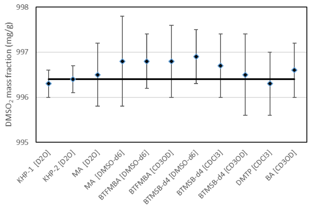 The equivalence of the results obtained is illustrated for the case of DMSO2, the sole ISRM soluble in each of the major deuterated solvents. The reference value for its purity was assigned by combination of the results obtained in three independent direct measurements against the primary reference materials that anchor our traceability scheme—two independent determinations using the two CRMs for KHP as IS in solution in D2O and two determinations using the BTFMBA CRM in solution in either DMSO-d6 or CD3OD. Because benzoic acid has been widely used as a qNMR primary standard [11, 17] we also investigated the applicability of our optimized parameter set for the 1H-qNMR purity assignment of DMSO2 using the NIST CRM 350b for benzoic acid as the internal standard in solution in CD3OD.