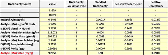 Table 4. MU components for assignment of MA purity by 1H-qNMR using KHP as internal standard.