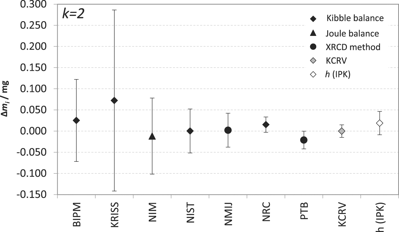 Figure 1. Differences Δmi between mass values attributed to a 1 kg mass standard using the realization experiments of the participants and the key comparison reference value (KCRV), calculated as the weighted mean. The uncertainty bars represent the expanded uncertainty. h(IPK) represents the value based on the BIPM working standards, traceable to the Planck constant h through the IPK.