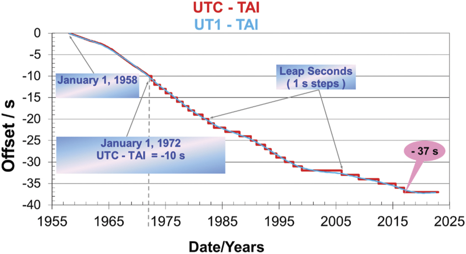 Standard image High-resolution imageAlthough the GNSS system times are intended to be only a parameter internal to the operation of their systems, they are often used as a reference time scale in other applications because they are easily accessible world-wide. The widespread use of GNSS system times introduces confusion amongst users and creates a risk of potential synchronization errors. For example, a recent recommendation by ITU-T explains the need for a continuous reference time scale for the telecommunication networks and recommends GPS time without leap seconds as an alternative to UTC [7]). The use of GPS system time as a proxy for UTC introduces an ambiguity because the current difference between UTC and GPS system time shown in table 1 will change each time a leap event occurs.