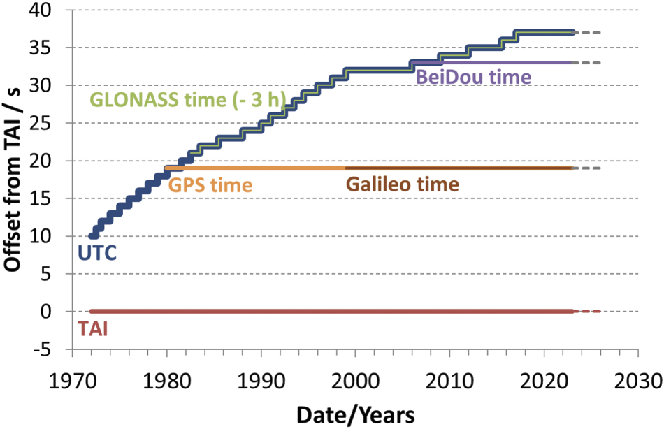 Figure 2. Offset between UTC, the GNSS system times, and International Atomic Time TAI.GLONASS time has a constant offset of 3 h with respect to UTC.