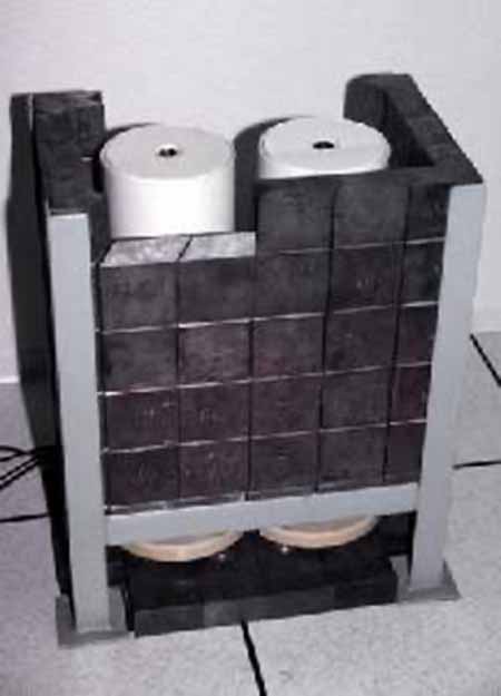 Figure 1. The ionization chambers used for the international reference system for gamma-emitting radionuclides (the SIR) at the BIPM. The photograph was taken during construction of the instrument with the lead shield partially completed and it shows two re-entrant ionization chambers (the second chamber is a back-up in case of problems with the main instrument). NMIs send a sample of the radionuclide in solution in a glass ampoule; the ampoule is placed in a holder and lowered into the well in the chamber (the hole can be seen at the top of the chambers). The current produced in the chamber is proportional to the activity of the radionuclide in the sample.