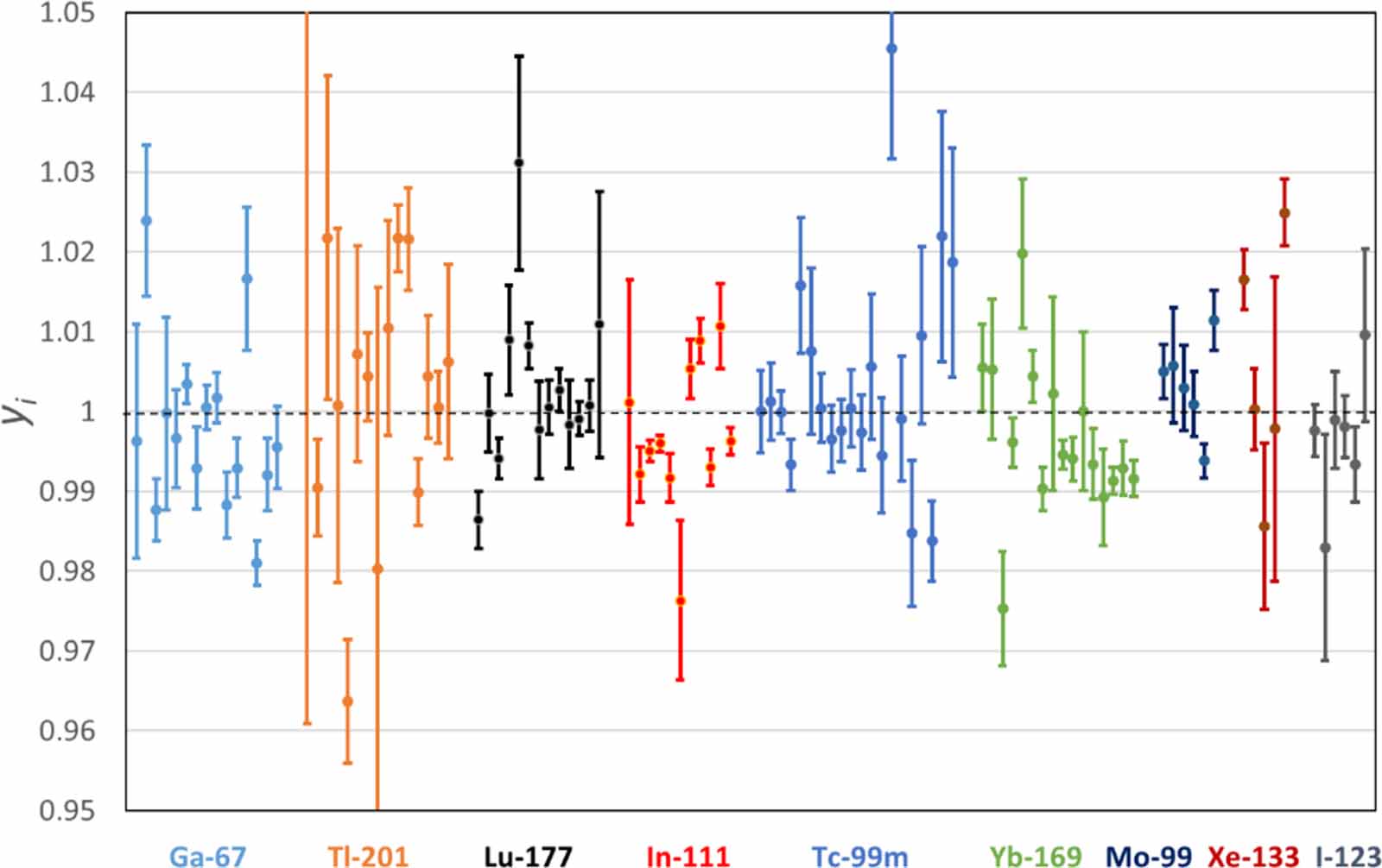 Figure 3. Equivalence of primary standards used for SPECT. For a given radionuclide, data points are sorted in chronological order of SIR submissions. Error bars represent ±1 standard uncertainty about the measured value.