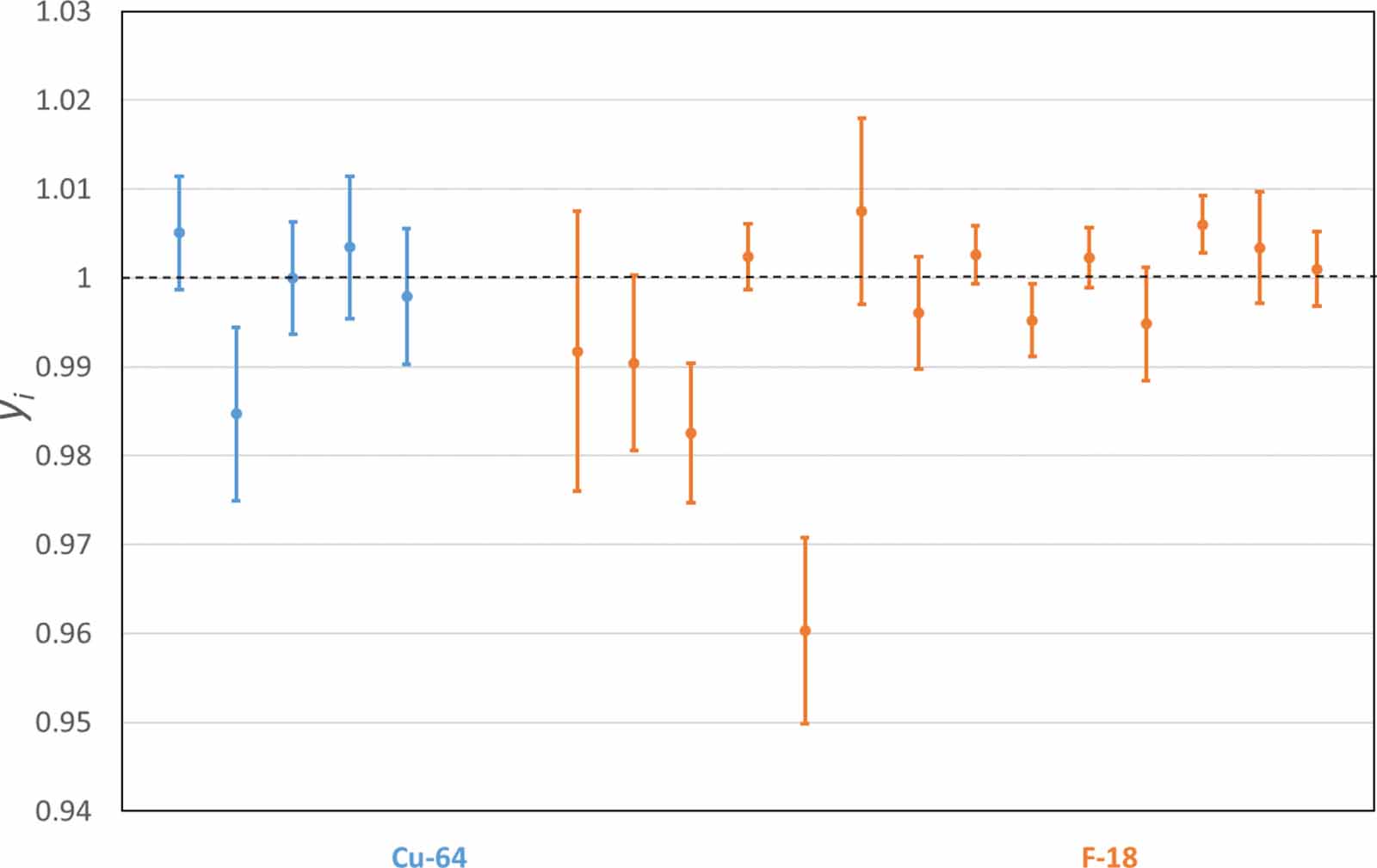 Standard image High-resolution imageFigure 4. Equivalence of primary standards used for PET. For a given radionuclide, data points are sorted in chronological order of SIRTI submissions. Error bars represent ±1 standard uncertainty about the measured value.