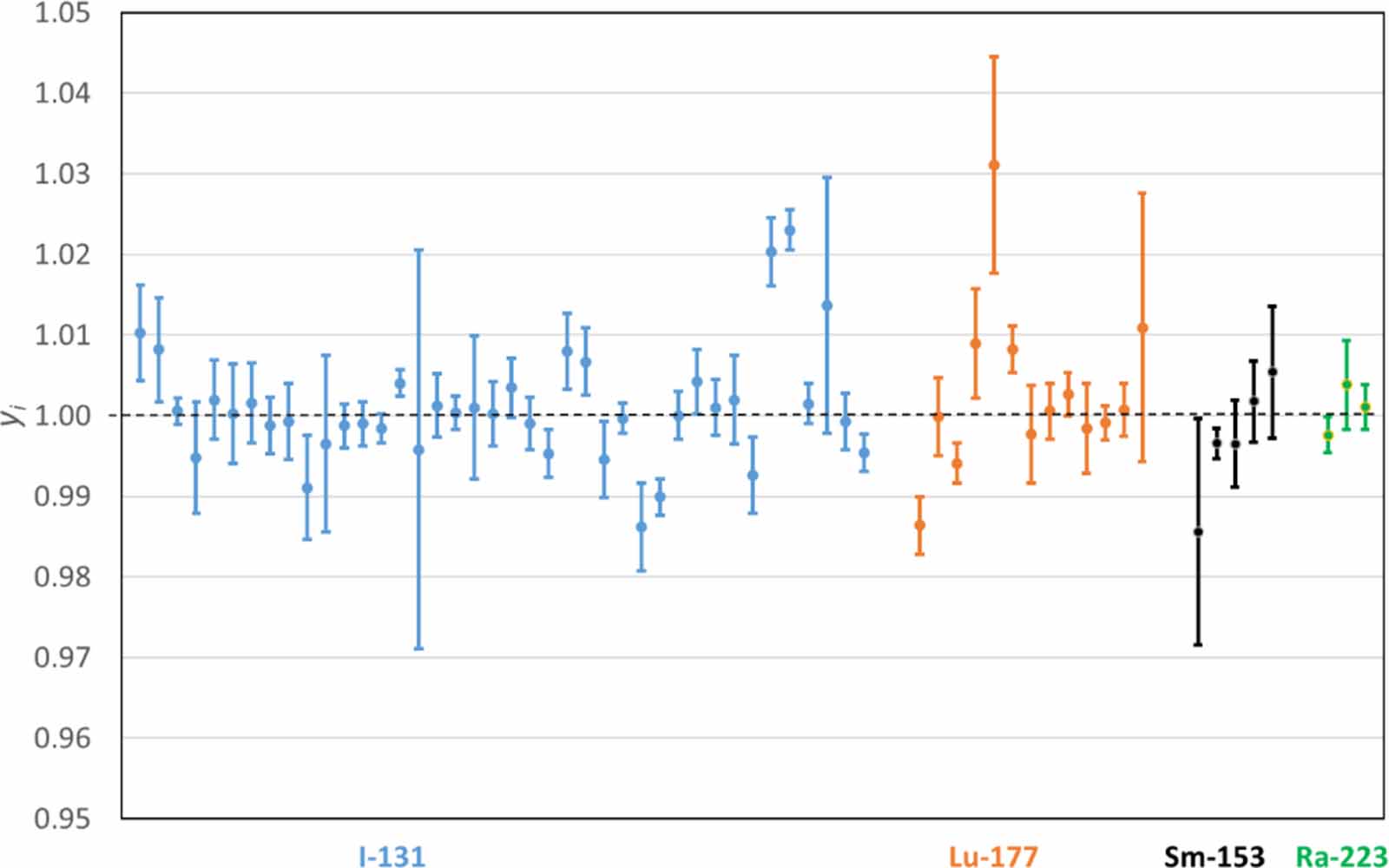 Figure 5. Equivalence of primary standards used for therapy. For a given radionuclide, data points are sorted in chronological order of SIR submissions. Error bars represent ±1 standard uncertainty about the measured value.