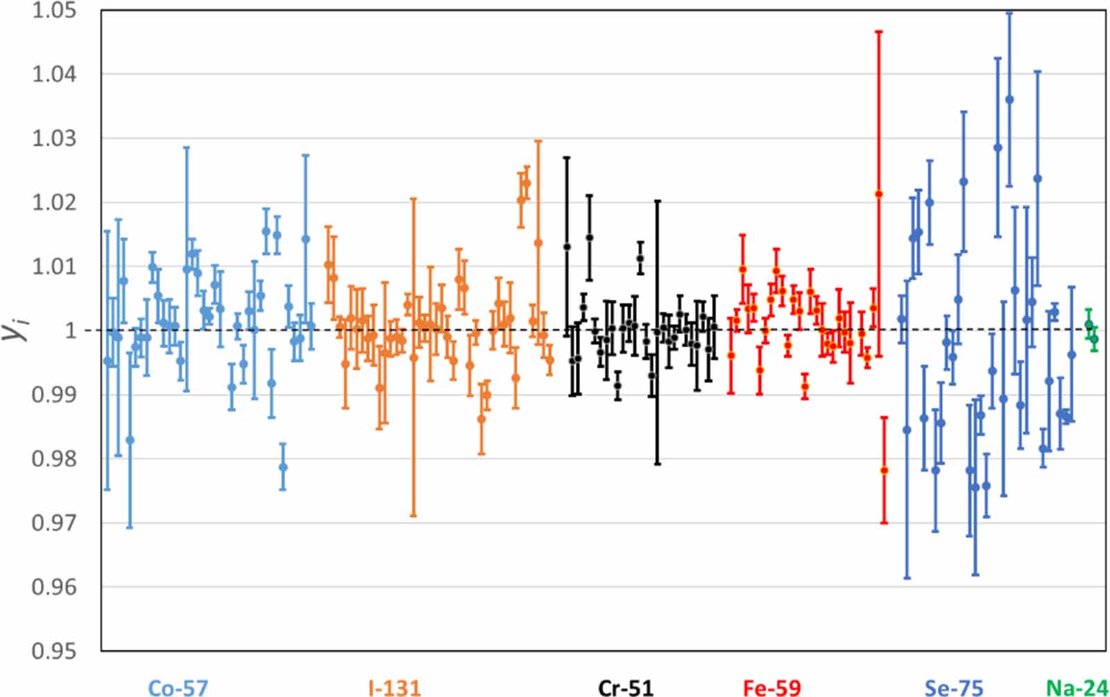 Figure 6. Equivalence of primary standards used for in-vitro diagnostics. For a given radionuclide, data points are sorted in chronological order of SIR submissions. Error bars represent ±1 standard uncertainty about the measured value.