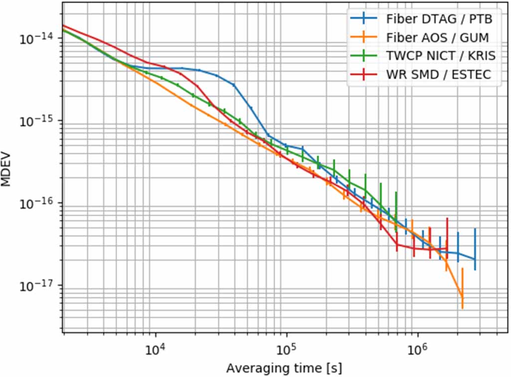 - Frequency stability: 10−17–10−16 for satellite microwave techniques (GNSS, TWSTFT); 10−20 level for fibre links [125]