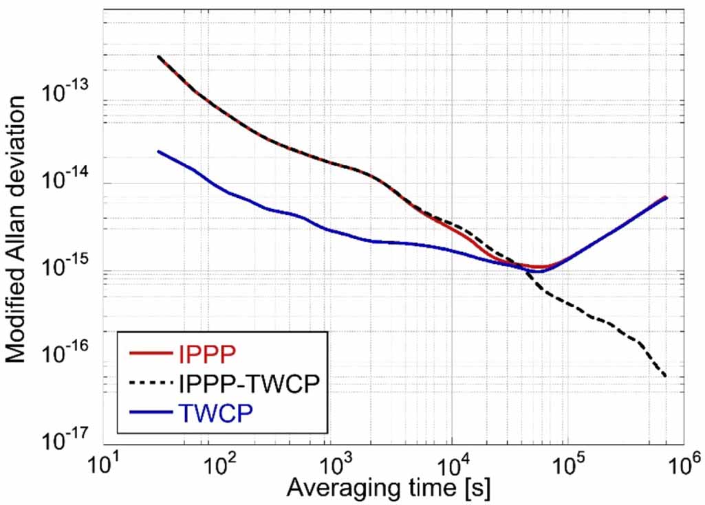 Standard image High-resolution imageTWSTFT, the second intercontinental-capable satellite-based microwave method, typically employs the code-phase of a signal modulated by a pseudorandom noise code sent and received by microwave link via a geostationary telecommunications satellite, at Ku-band frequencies [71]. Improved performance is achieved by the use of Two-Way Carrier-Phase (TWCP), which exploits carrier-phase measurements, with an instability of a few parts in 1016 at one day. Further results [72] indicate that TWCP performs at least as well as IPPP in terms of stability. Figure 2 shows the modified Allan deviation of Code Phase and Carrier Phase TWCP.