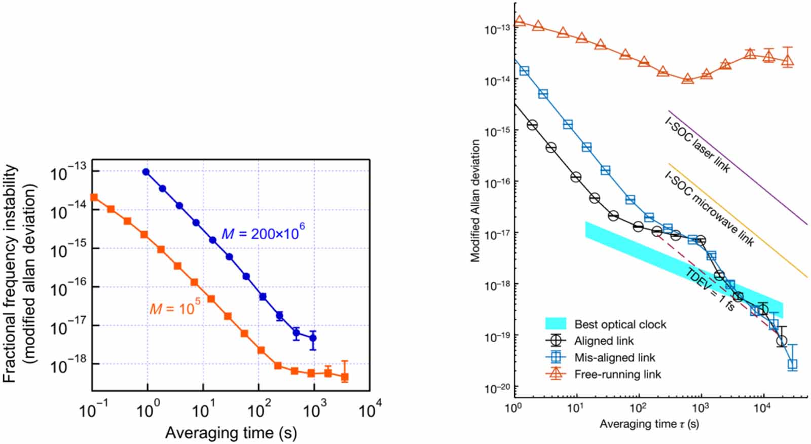 Figure 3. Free space optical link fractional frequency instability. Left: Modified Allan deviation over 28 km [Reproduced with permission from [78]. Copyright 2021 American Chemical Society]. M is the ratio fr/Δfr, where fr is the nominal repetition rate, and Δfr is the real difference between the repetition rates of the two involved combs. Right: Modified Allan deviation over 113 km [Reproduced from [79], with permission from Springer Nature.] (Black circles, well-aligned free-space time–frequency link; blue squares, mis-aligned link; orange triangles, free-running link). The performances of the best optical clock, the I-SOC (Space Optical Clock on the International Space Station) laser link, the I-SOC microwave link and the TDEV of 1 fs are also shown.