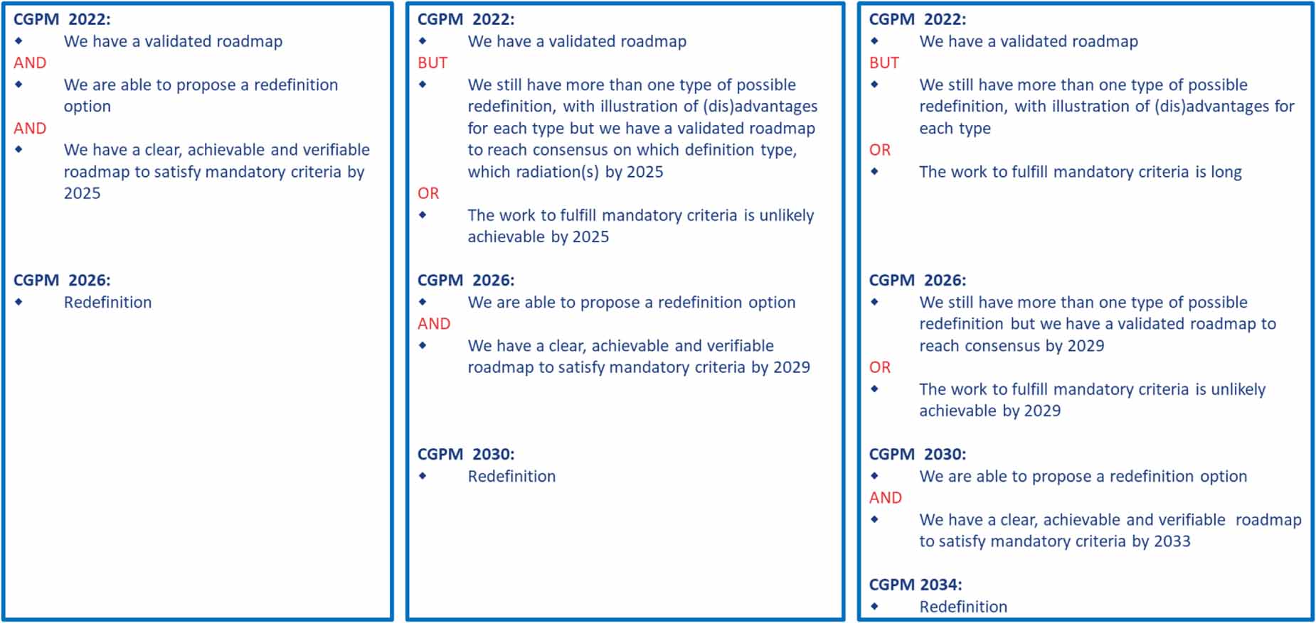 Standard image High-resolution imageIt appeared clear that a redefinition at the 28th meeting of the CGPM (2026) was unrealistic since today there is no consensus on the preferred option and still some important work to do to fulfil all mandatory criteria. The 28th CGPM (2026) could validate a roadmap towards a redefinition in 2030 if, in 2026, there is a consensus on the redefinition option to be chosen and if the work to fulfil mandatory criteria is likely to be achievable by 2030. If a redefinition is not possible in 2030, it will have to be postponed until the meeting of the CGPM to be held in 2034 or the following one. But, with this third scenario, it will require the continued operation of Cs fountains primary frequency standards until the late 2030s.