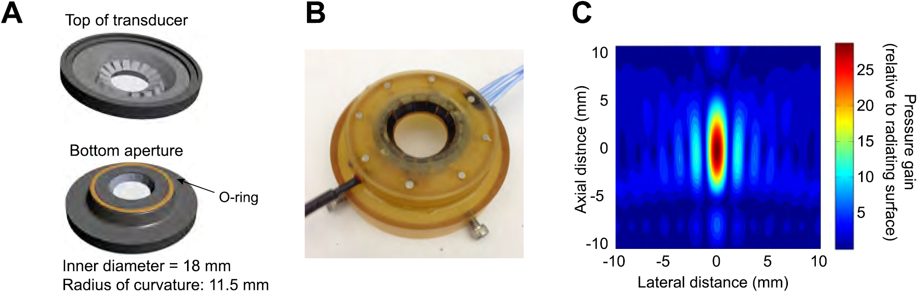 Figure 2. Custom short working-distance, wide aperture FUS transducer. (A) Rendered depictions of the top and bottom faces of the transducer. The transducer features 16-elements arranged in a ring array, and the acoustic focus is 3.5 mm below the bottom of the transducer. When integrated into the imaging system, the acoustic focus coincides with the optical focus (see text for additional technical details). (B) Photograph of the transducer. (C) Simulated acoustic pressure profile. The color scale represents pressure gain relative to the radiating surface of the transducer.