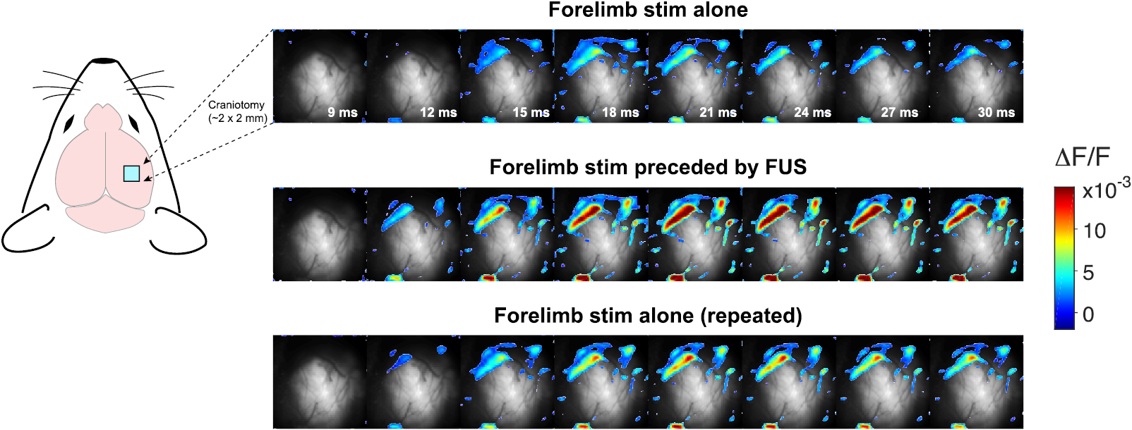 0.5 NA objective. Through the optical clearance in the transducer, epifluorescence functional imaging can be performed in vivo. (B) Time sequence of the imaging experiments in which FUS was administered. FUS was delivered for 1 s, followed by brief electrical stimulation of the forelimb and optical recording at the site of FUS for 0.5 s. Trials were separated by 30 s. (C) Depiction of the imaging region. The ~