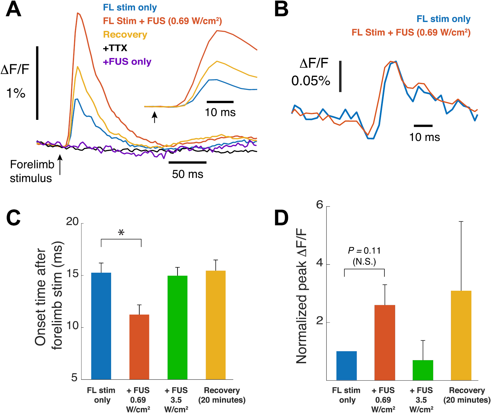 Standard image High-resolution imageFigure 4. Focused ultrasound pre-treatment reduces the latency of sensory-evoked cortical responses in vivo. (A) Time course of voltage signals recorded optically in one experiment. The traces represent the activity in a region of interest which is more fully defined in Results. The black arrow indicates the point at which a 200 µs pulse of current (~1 mA) was delivered to the median nerve of the forelimb (FL) contralateral to the hemisphere being imaged. The black trace shows the response to stimulus with FUS pretreatment in a different animal in which TTX 10 µM was also applied. The inset depicts the voltage responses on a magnified timescale that shows only the first 40 ms after forelimb stimulus. (B) Region-averaged voltage traces obtained from VSD imaging of a different animal than shown in (A). In this experiment, FUS did not significantly alter the peak fluorescence changes, but the reduced delay is still evident. The signal-to-noise ratio appears smaller than in (A) because the baseline fractional changes were considerably smaller (the maximum amplitude was less than 0.1%). (C) Bar chart comparing the onset times of the voltage responses when delivered in the absence of FUS, when preceded by FUS at peak intensities of 0.69 W cm−2 and 3.5 W cm−2 (Isppa), as well as in subsequent 'recovery' trials that were not preceded by FUS. The first two conditions differed significantly (P = 0.028, Wilcoxon rank sum test, n = 7). Onset latency was defined as the time at which the fluorescence response rose above two standard deviations of the baseline optical signal variability (i.e. z-score > 2). (D) Peak fractional fluorescence normalized to baseline signals for all experiments (n = 7 for 0.69 W cm−2, n = 4 for 3.5 W cm−2). While pre-treatment with 0.69 W cm−2 FUS increased the peak on average, given the variability (e.g. (A) versus (B)), these changes were not significant within our sample size. Error bars in (C) and (D) represent standard error of the mean.