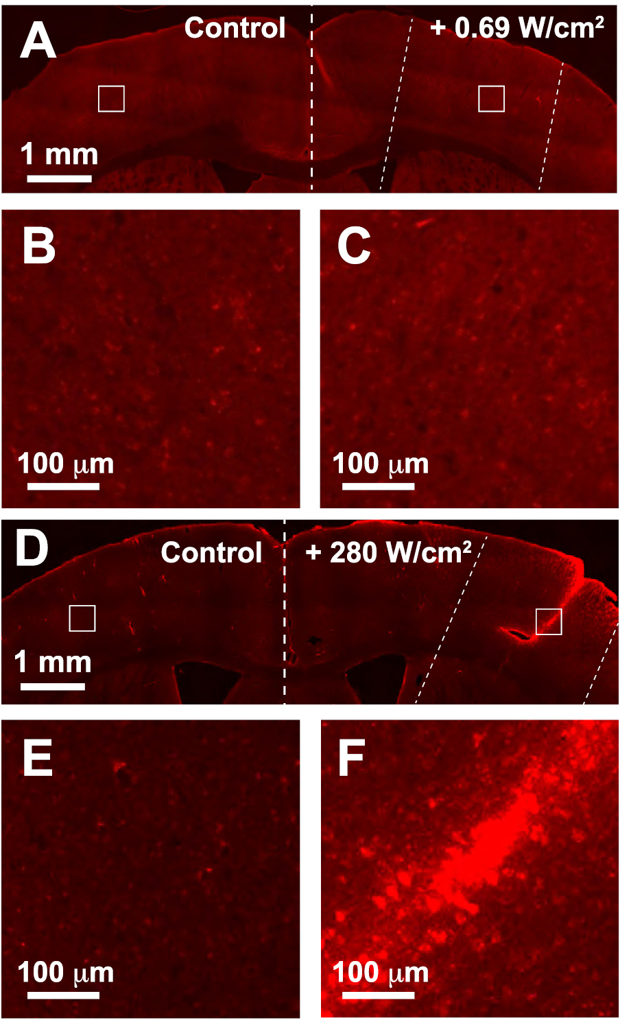 Figure 6. GFAP expression 24 h post-exposure to FUS. (A) Survey view of the cortex in a coronal brain section of a mouse that had been subjected to the same intensity of FUS used in our imaging experiments, 0.69 W cm−2 (Isppa). One hemisphere was exposed to FUS (right) and the other unexposed (left, labeled 'control'). The diagonal dotted lines on the right hemisphere represent the pathway and approximate width of the ultrasound beam. (B) and (C) are enlarged views of the areas in the squares superimposed on (A). Control and FUS-exposed regions are shown in (B) and (C), respectively. (D)–(F) use the same depiction format for an animal exposed to significantly higher intensity FUS (280 W cm−2), serving as a positive control. Activated astrocytes are visible in (F).